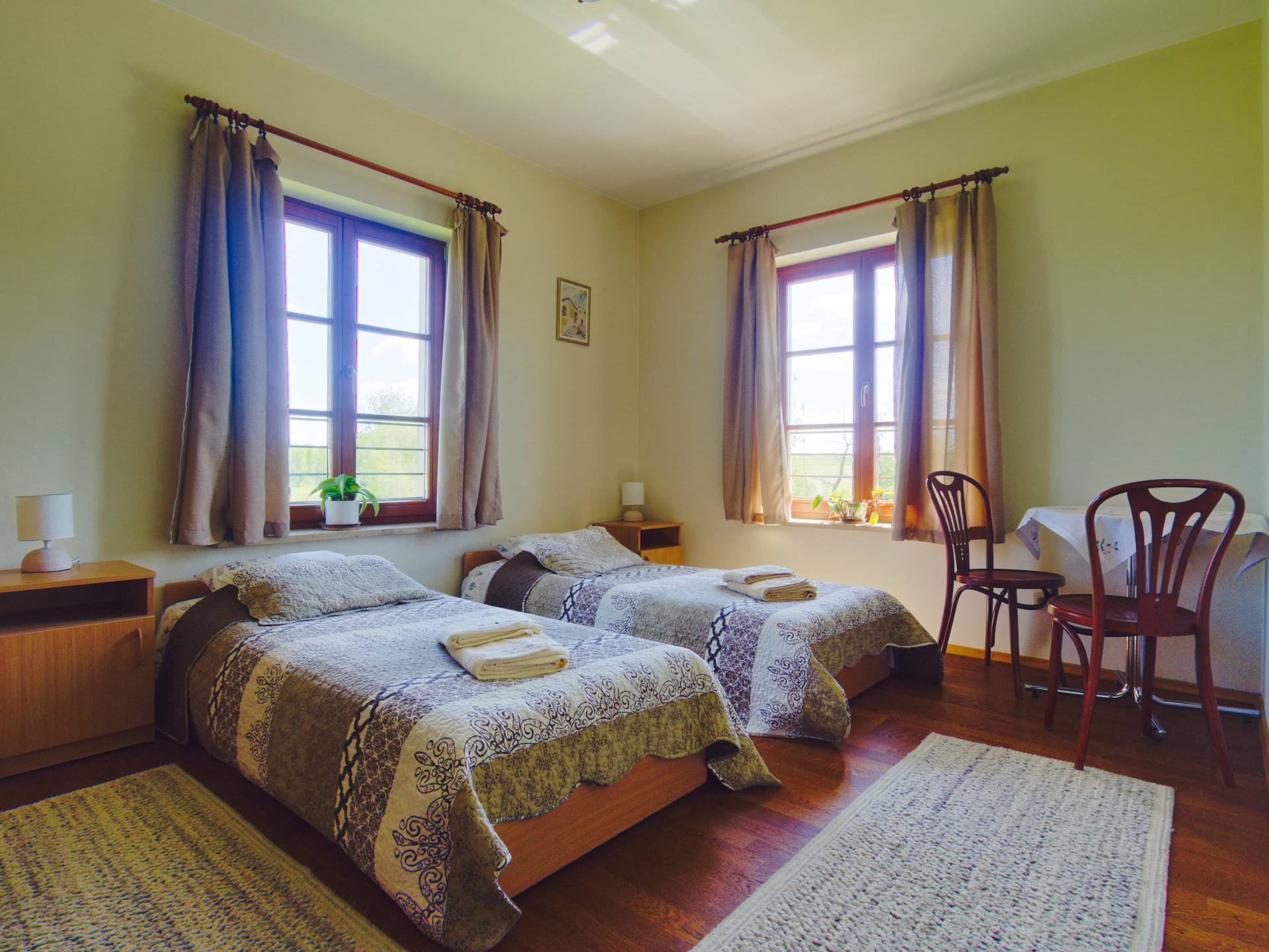 Na parterze mieści się salon z kominkiem i stołem jadalnym, wyjście na duży taras z meblami ogrodowymi, kuchnia oraz 1 apartament 2-4 os. (2 łóżka poj. oraz rozkładana kanapa) z łazienką. Na piętrze dwa 5-osobowe apartamenty, w każdym z nich przedpokój, pokój 2-os., pokój 3-os. z balkonem oraz łazienka. Pokoje 3-os. są przestronne, w każdym możliwość dostawki. Obok aneks kuchenny wraz z miejscem do wypoczynku i TV, balkon.